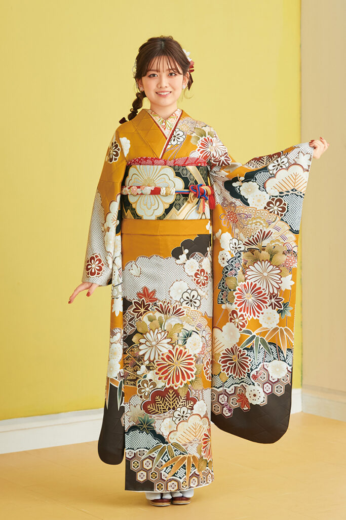 大ぶりの扇面と松竹梅が手を携え、足元のこげ茶が引き締め効果抜群です。辛子色で魅せる振袖は、人とは違うスタイルに挑戦したい方に。 振袖価格:308,000円振袖カラー:黄色振袖タイプ:レトロ・ポップ